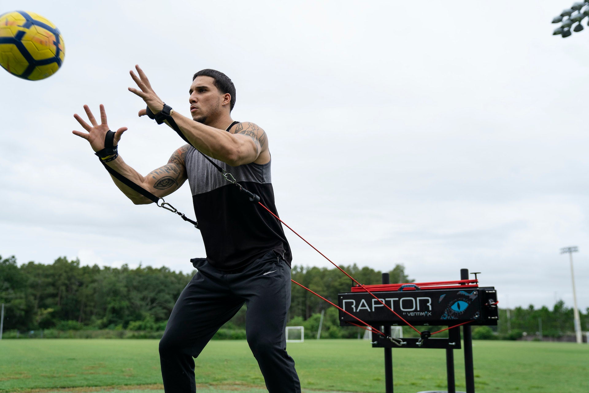 Уровень устройства Raptor можно отрегулировать, просто отпустив оба кулачковых зажима, чтобы сдвинуть устройство Raptor на желаемую высоту на салазках для тренировок.