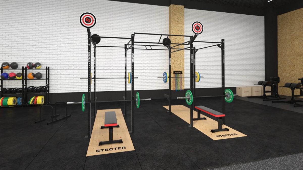 - навесные брусья; - страховочные упоры для приседаний со штангой; - J-крюки (комплект); - консольная цель для бросков медбола.