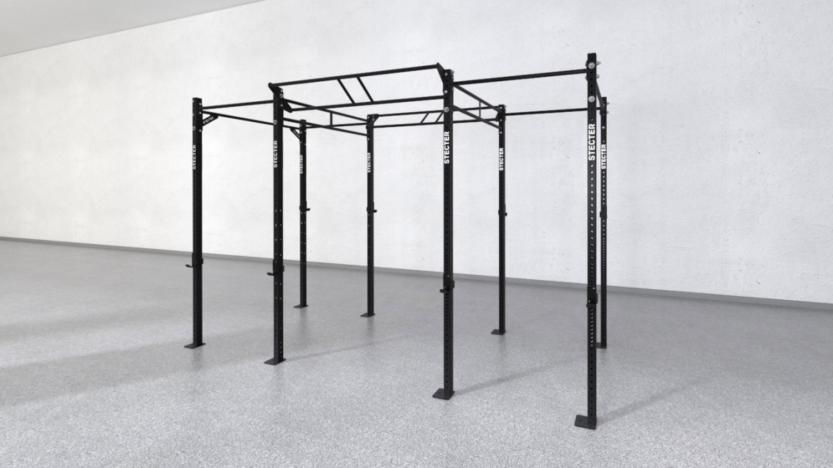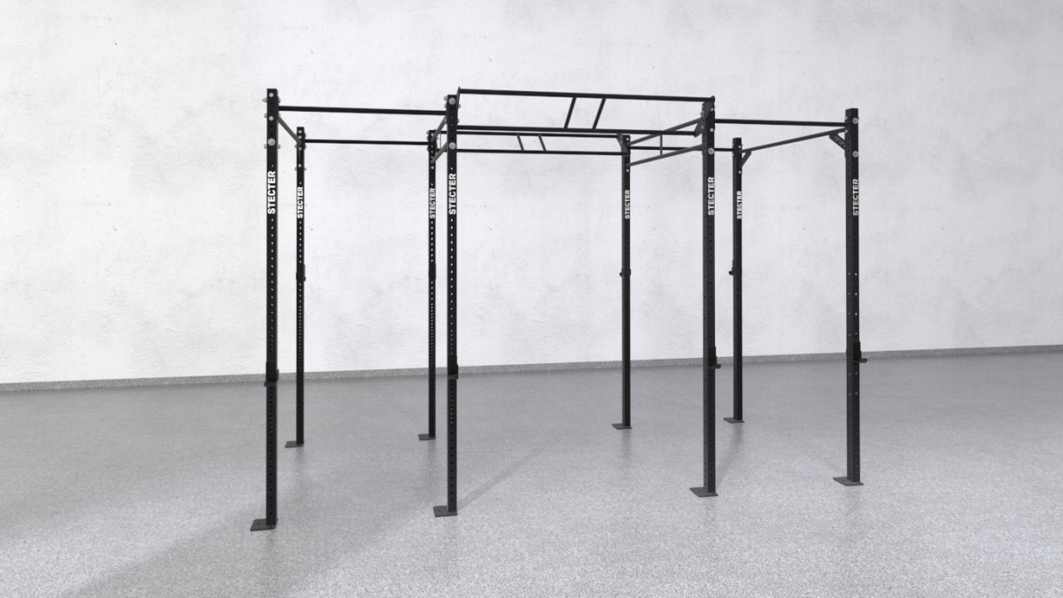 Трехсекционная функциональная рама комплектуется восемью опорными стойками высотой 2810 мм. Они соединены одинарными и двойными перекладинами по 1100 мм и 1800 мм, а так же J-крюками для штанги. Сборка рамы производится при помощи болтовых соединений. Снаряд также необходимо закрепить к полу анкерными болтами. Высота рамы позволяет использовать такие снаряды, как гимнастические кольца, канат и т. д. Опорные стойки производятся из профильной трубы 80х60 мм. Толщина стенок составляет 3 мм, благодаря чему снаряд имеет большую устойчивость к нагрузкам.
