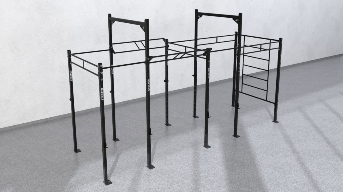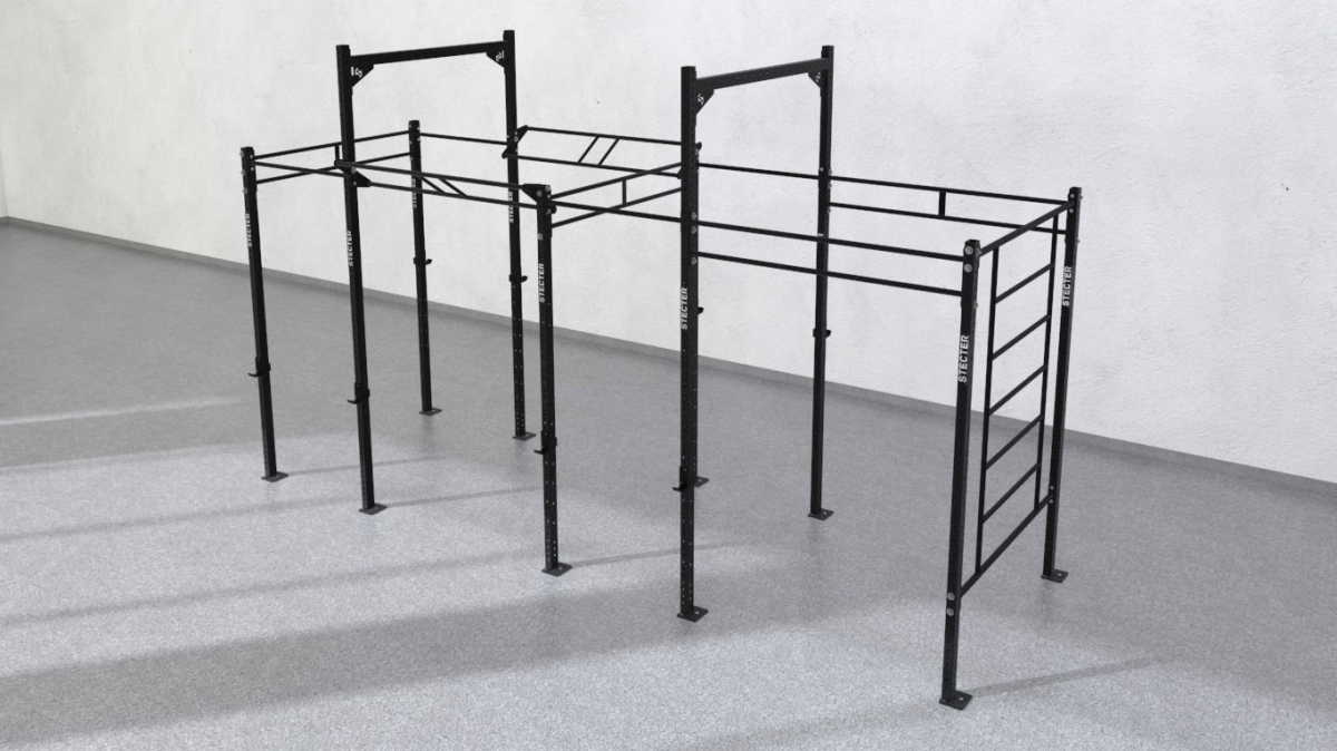 Функциональная рама для Кроссфит 5800х1800 состоит из четырех секций. Десять опорных стоек по 2810 мм и 3660 мм в высоту каждая соединены балками, одинарными и двойными перекладинами для подтягиваний длиной по 1100 мм и 1800 мм, а так же шведской стенкой 1800 мм в ширину. Рама комплектуется крепежами для сборки. Все опорные стойки необходимо закрепить к полу. Стойки изготовляют из профильной трубы 80х60 мм. Толщина элементов рамы составляет 3 мм – достаточно для того, чтобы выдерживать значительные нагрузки, в том числе установку гимнастических колец, каната и др. инвентаря.