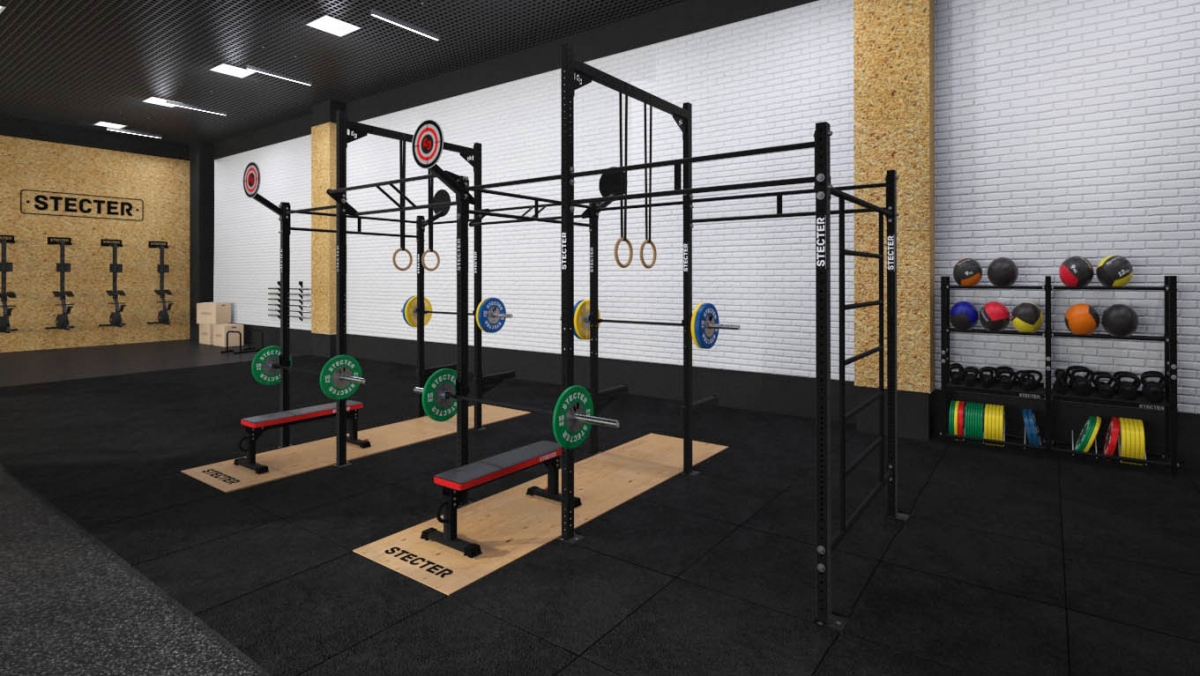 - навесные брусья; - страховочные упоры для приседаний со штангой; - J-крюки (комплект); - консольная цель для бросков медбола.