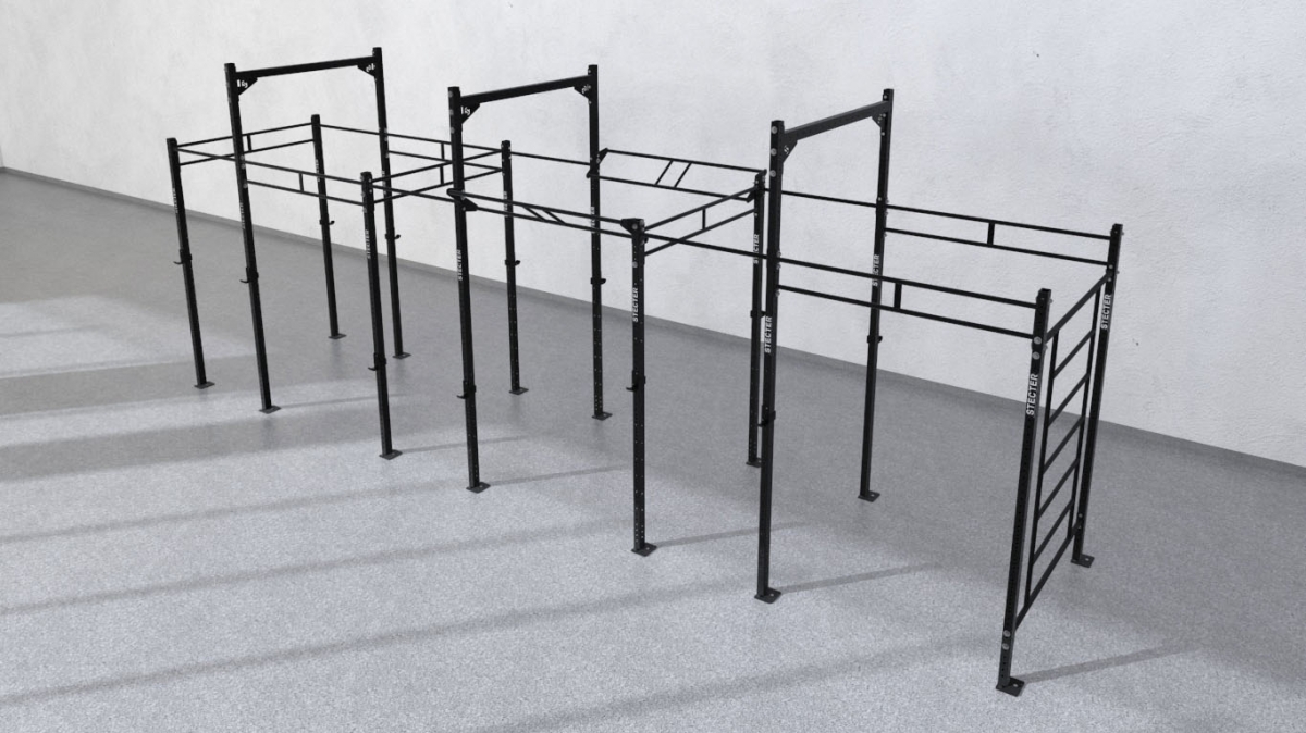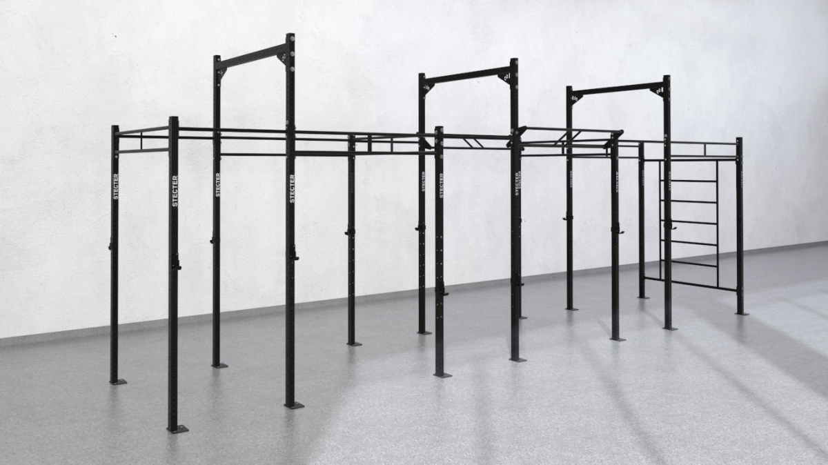 Рама для Кроссфит 8700х1800 мм состоит из шести секций, образованных четырнадцатью опорными стойками, одинарными и двойными перекладинами длиной 1100 мм и 1800 мм, а так же шведской стенкой. Стойки имеют высоту 2810 мм и 3660 мм, что позволяет крепить на них гимнастические кольца, канаты и другое оборудование. Они изготовлены из стальной профильной трубы 80х60 мм с толщиной стенки 3 мм. Все стойки прикреплены к полу. Перекладины для подтягиваний изготавливаются из круглой трубы с толщиной стенки так же 3 мм.