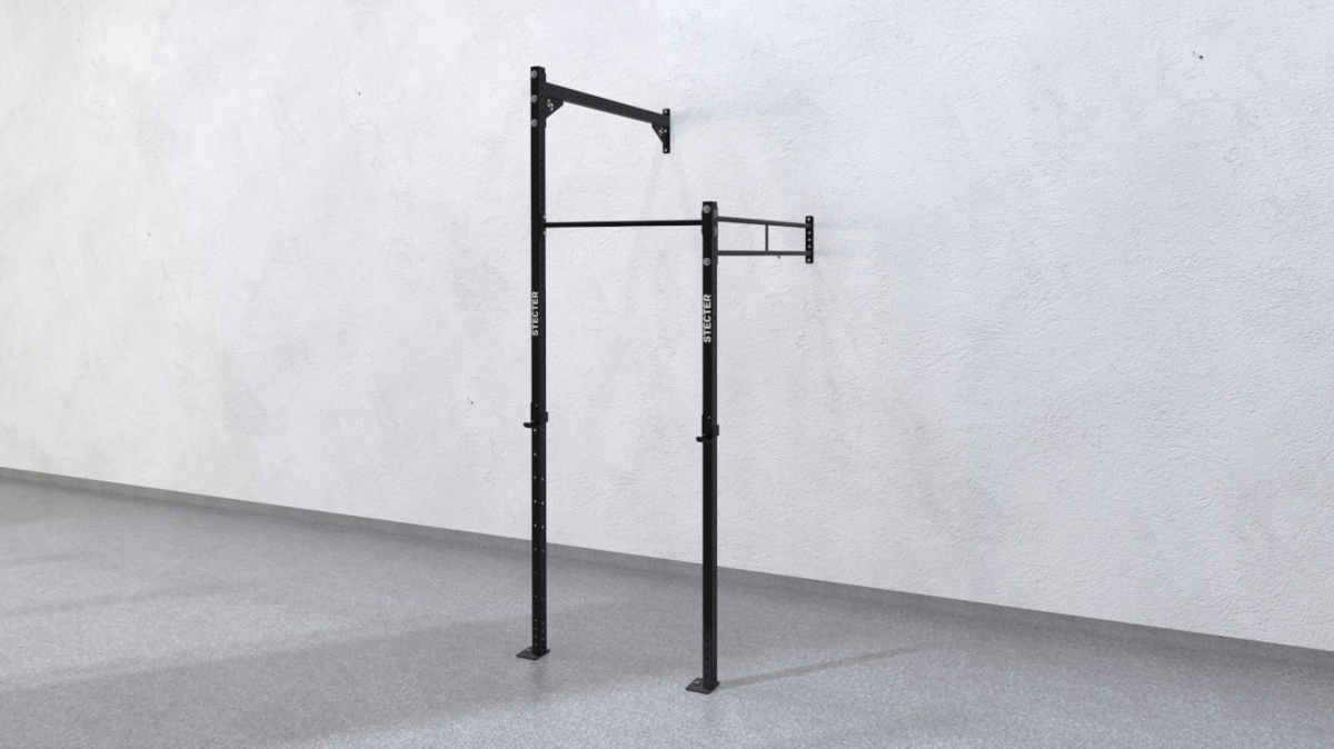 Стойки крепятся к полу, а свободные концы двойных перекладин по 1800 мм – к стене, образуя с ней жесткую сцепку. Для изготовления стоек используются стальные профильные трубы 80х60мм по 2810 мм в высоту. Этого достаточно для крепления даже таких снарядов, как гимнастические кольца и канаты. Опорные стойки перфорированы по всей длине одинаковыми отверстиями, которые служат для крепления дополнительного оборудования. Размер шага между ними составляет 30 и 50 мм.