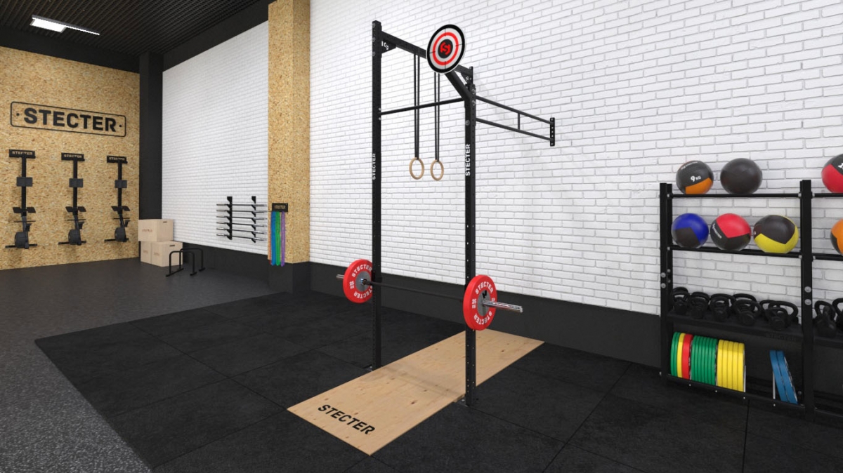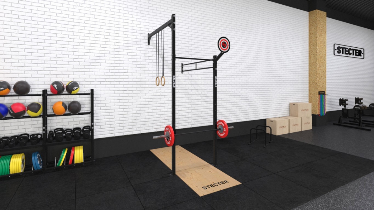- навесные брусья; - страховочные упоры для приседаний со штангой; - J-крюки (комплект); - консольную цель для бросков медбола.