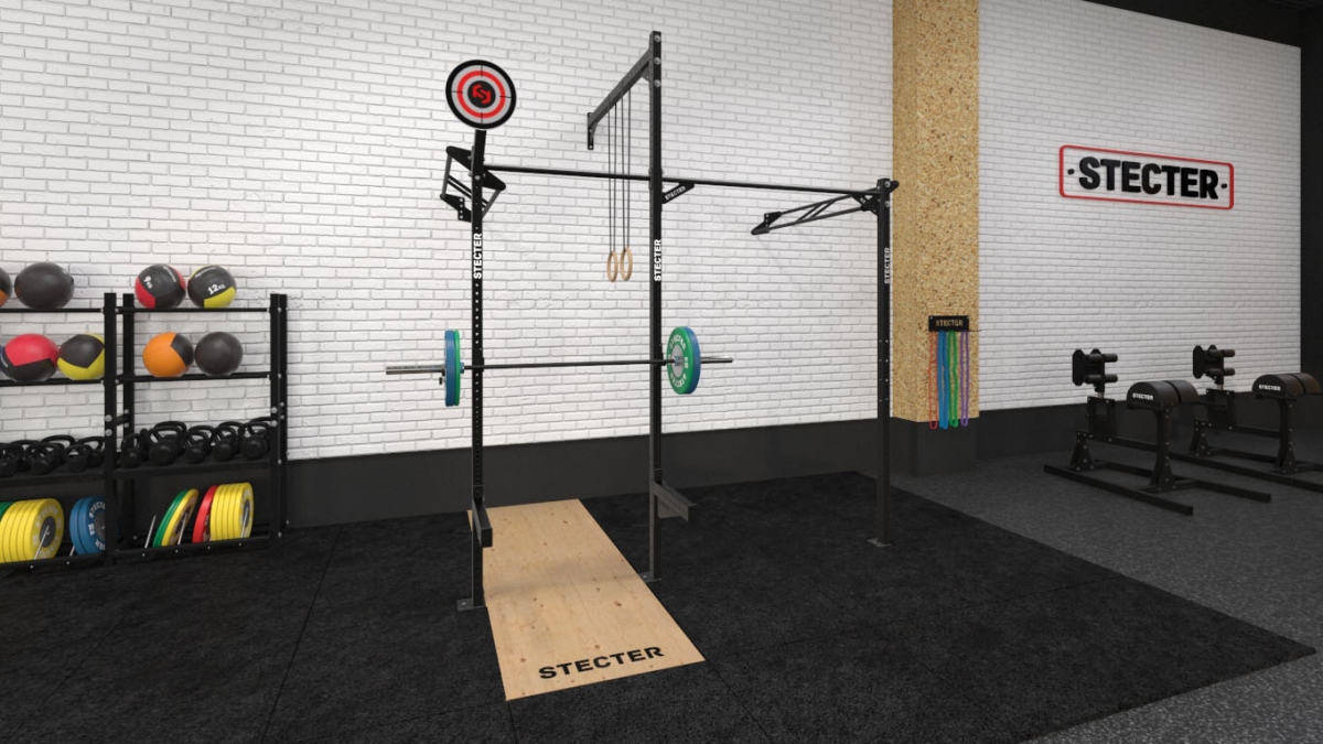 - навесные брусья; - страховочные упоры для приседаний со штангой; - J-крюки (комплект); - консольная цель для бросков медбола.