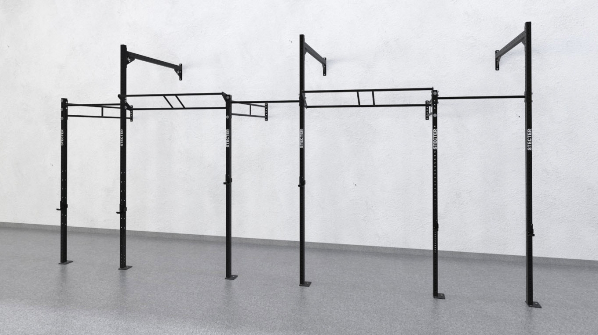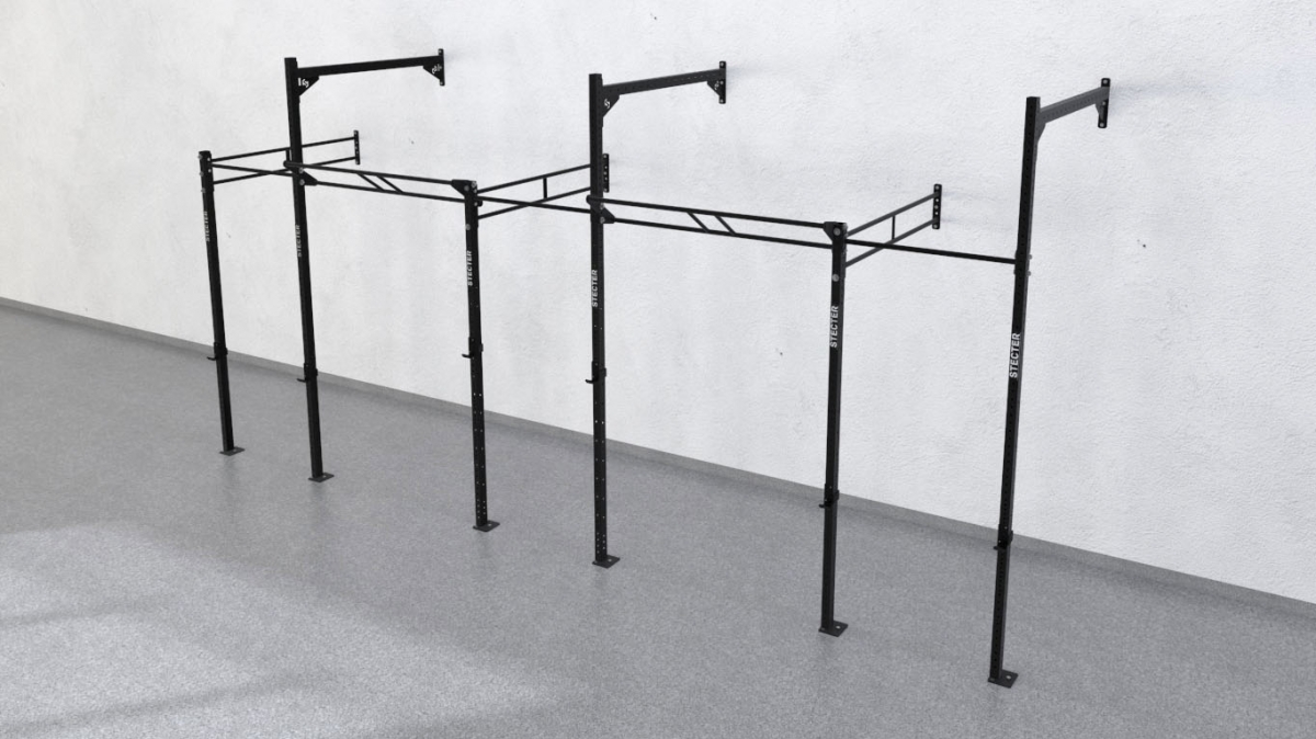 Пристенная рама состоит из 5 секций, собранных из шести стоек по 2810 мм и 3660 мм в высоту. Стойки соединяются балками, одинарными и двойными перекладинами длиной 1100 мм и 1800 мм. Также в комплекте поставляются крепежи для сборки снаряда. Материалом для изготовления стоек служит стальная профильная труба 80х60 мм с толщиной стенки 3 мм. Перекладины из круглой трубы и толщиной 3 мм также имеют хороший запас прочности. На них можно устанавливать гимнастические кольца и канаты. Собранная конструкция крепится к стене и полу, что обеспечивает ей особенную прочность и устойчивость.