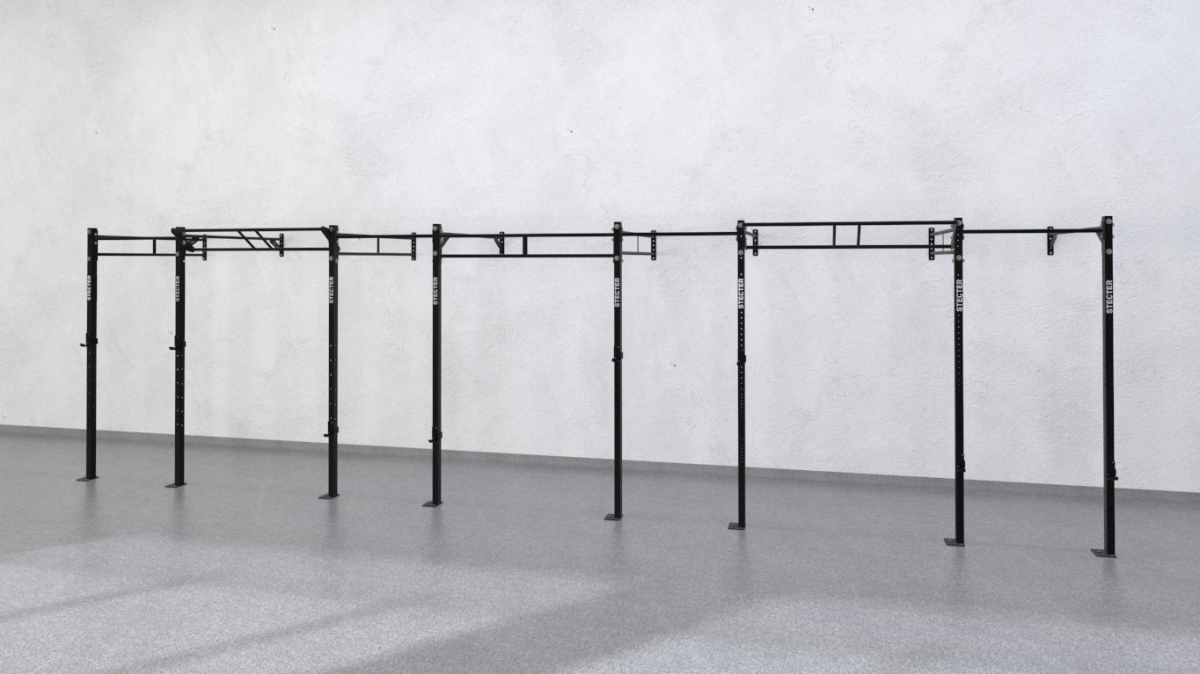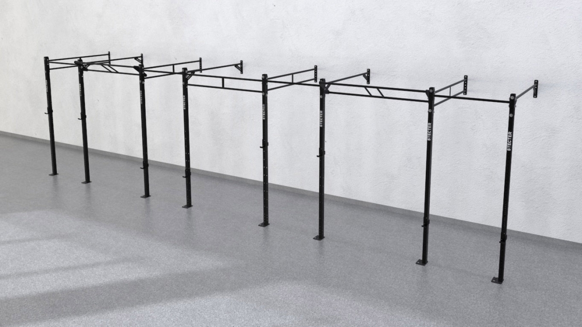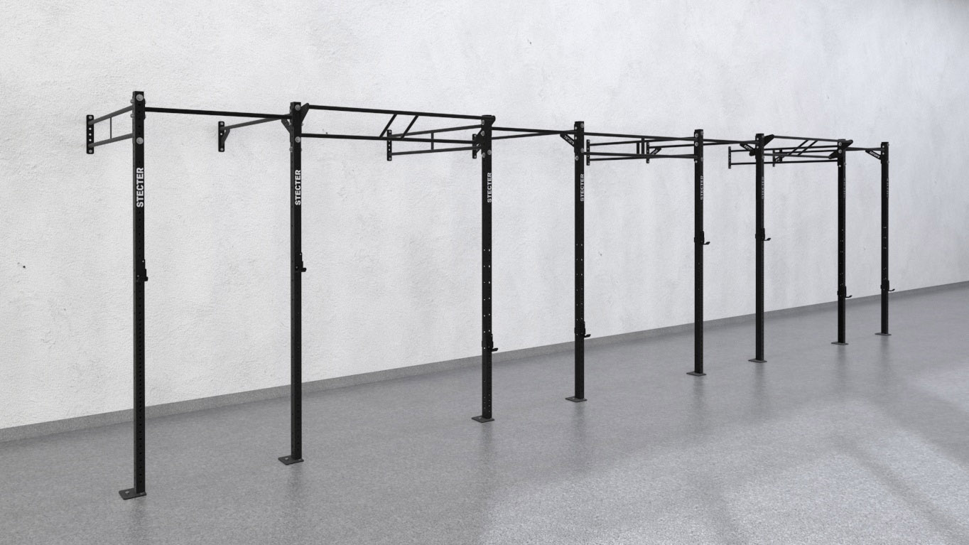 Пристенная рама для Кроссфит длиной 9,8 метра и шириной 1,8 метра состоит из семи секций. Восемь стоек высотой 2810 мм соединены перекладинами и балками. В комплект входит набор различных перекладин и балок длиной 1100 мм и 1800 мм. Конструкция собирается при помощи болтовых соединений. Все стойки прикрепляются к полу, перекладины также крепятся свободными концами к стене. Стойки произведены из профильной трубы 80х60 мм. Толщина металла, из которого изготовляются части рамы, - 3 мм. Высота и запас прочности конструкции позволяют крепить к ней гимнастические кольца и канат.