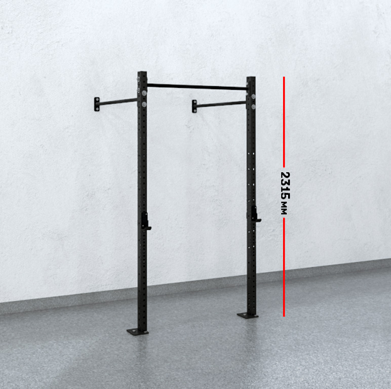 Опорные стойки функциональной рамы крепятся к полу. В верхней части они соединяются перекладинами, которые, в свою очередь, также монтируются к стене, обеспечивая жесткое соединение рамы с поверхностью. Материалом для изготовления стоек служит профильная труба 80х60 мм. Перекладины выполнены из круглой трубы. Толщина стенок стоек и перекладин составляет 3 мм. Толстые стенки обеспечивают конструкции большой запас прочности. Каждая стойка снабжена перфорацией – одинаковыми отверстиями, расположенными на расстоянии 30 и 50 мм.