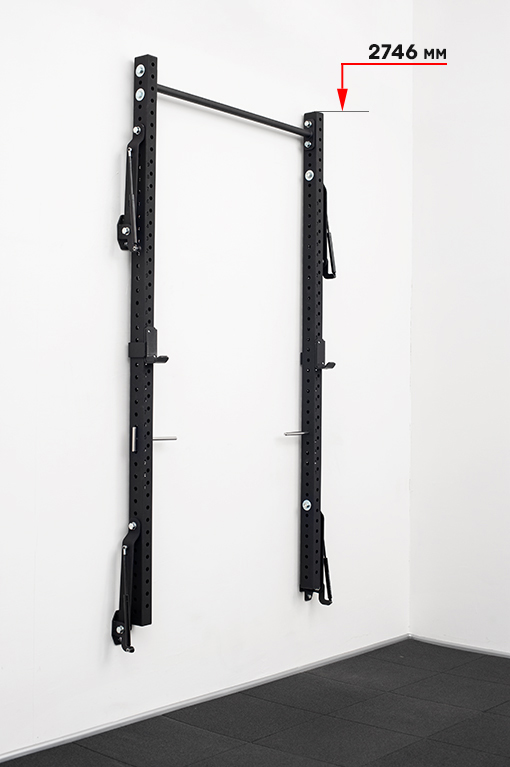 Пристенная складная силовая стойка позволяет проводить функциональные тренировки в небольших домашних и гаражных спортзалах. После тренировки она складывается и прилегает к стене, тем самым освобождая пространство в помещении. Специальные подъёмные механизмы помогают пользователю при складывании функциональной рамы к стене, таким образом с этим легко справится даже девушка. В сложенном состоянии опорные стойки могут быть зафиксированы с помощью колышков для резиновых петель (поставляются в комплекте), чтобы рама не могла разложиться - это сделано для обеспечения безопасности.