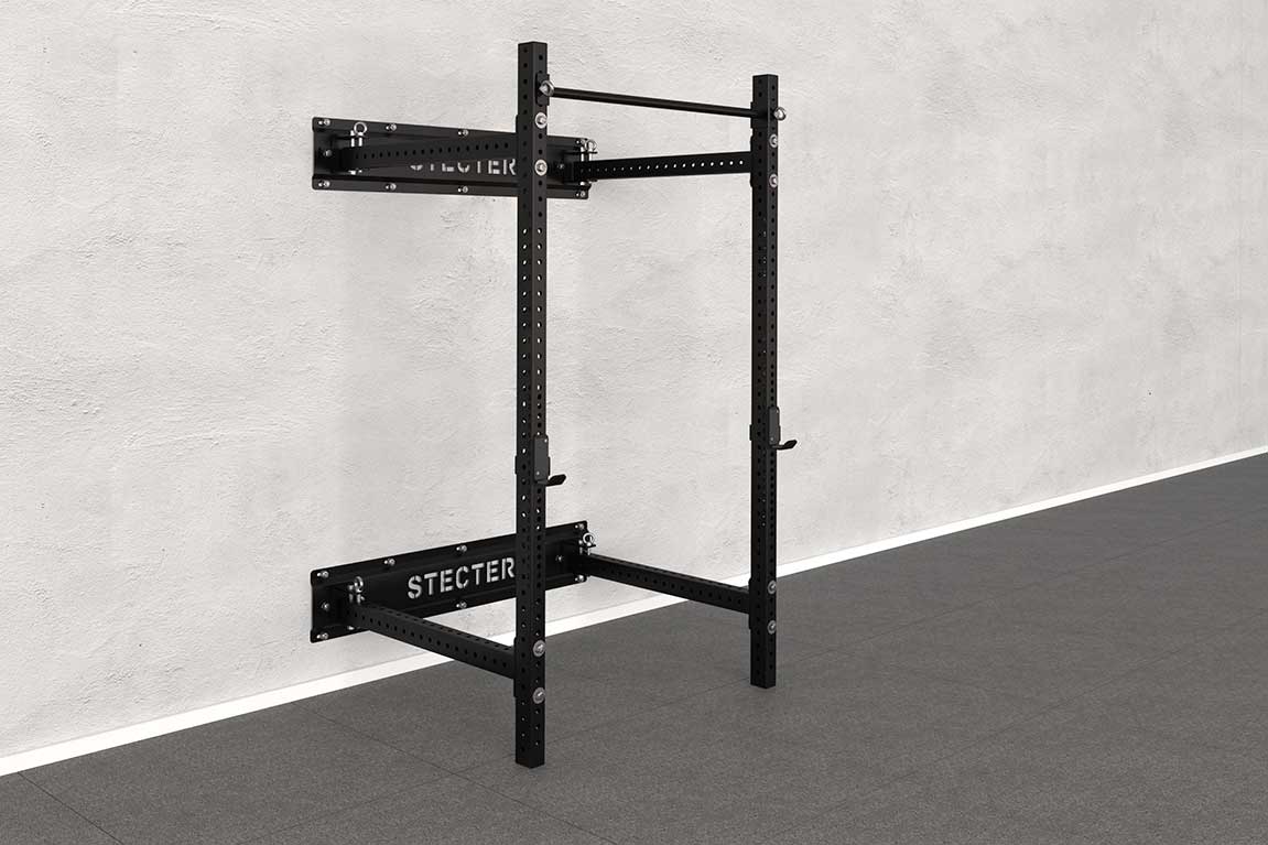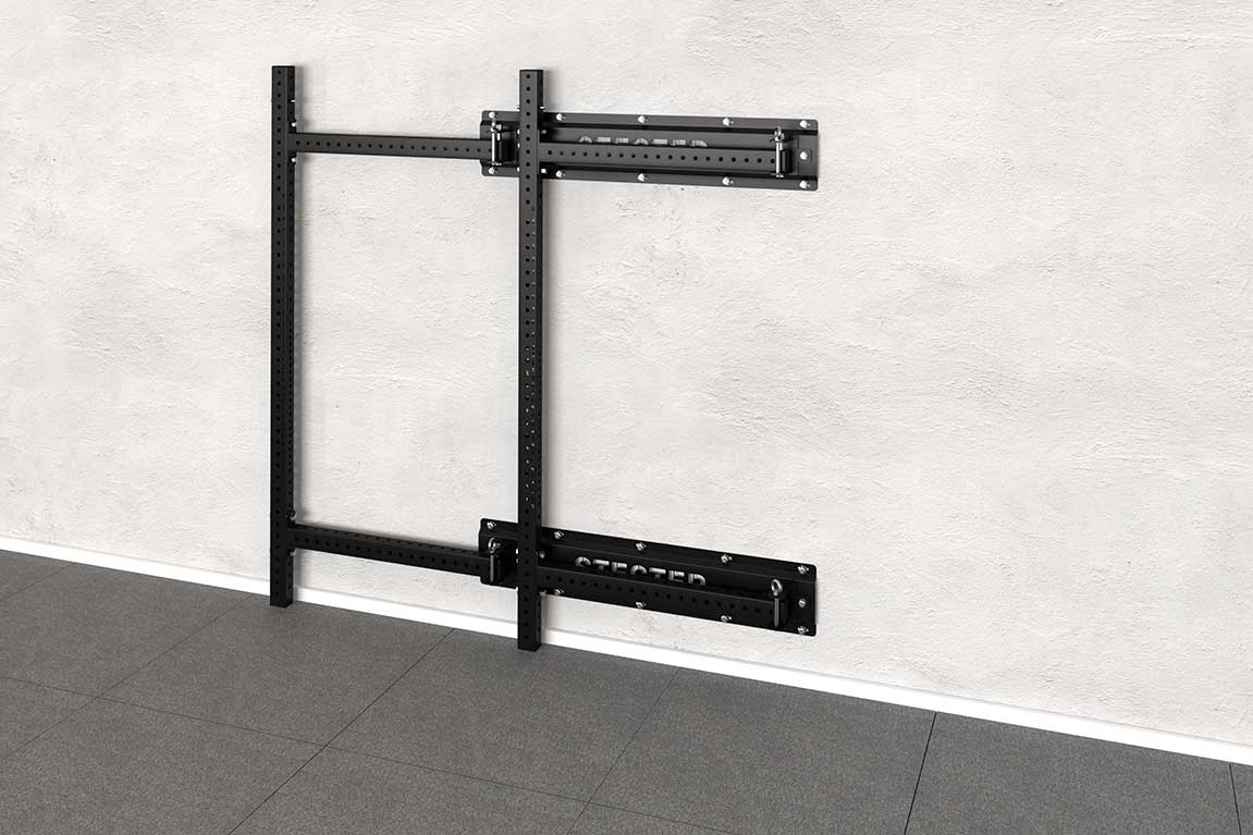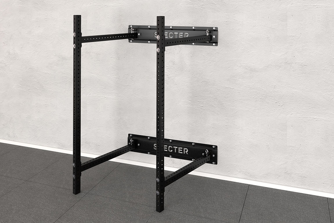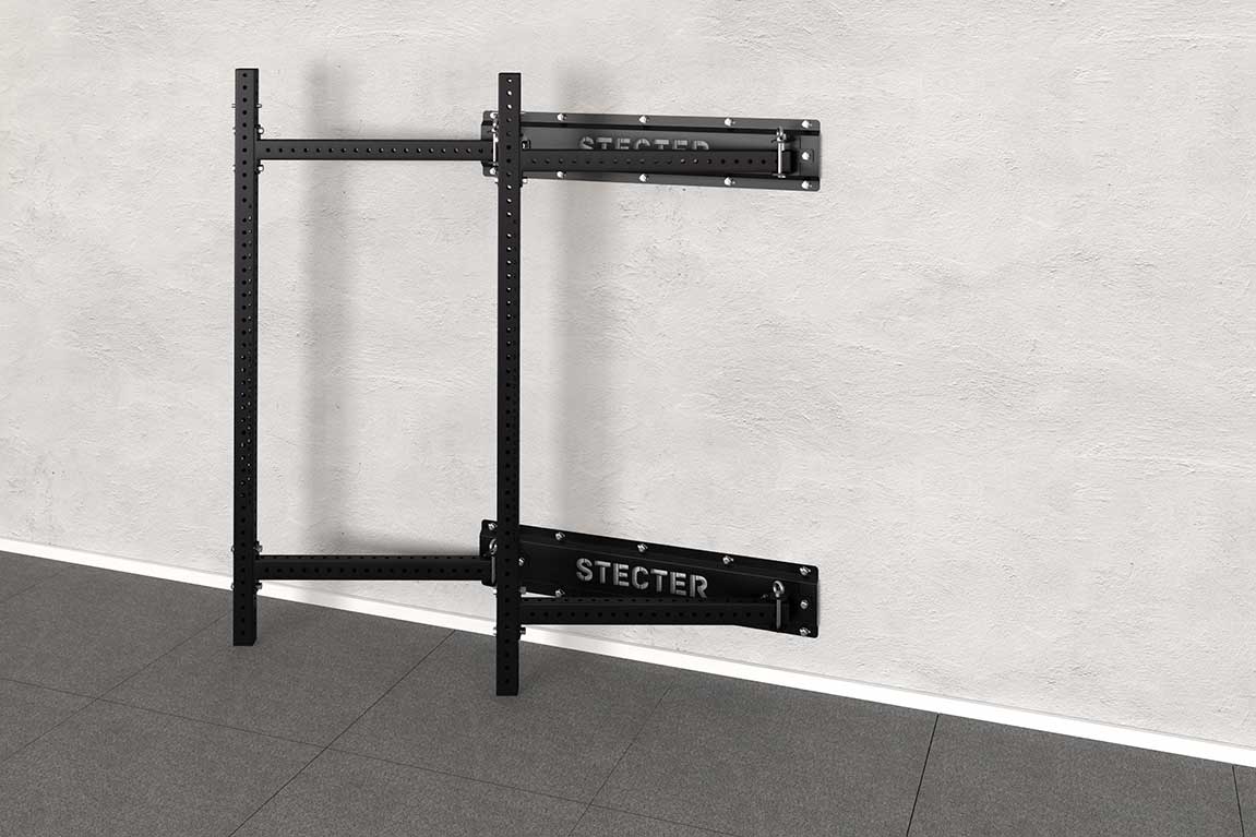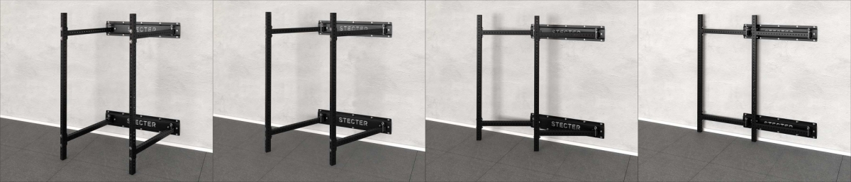 Для установки складной рамы для кроссфита необходимо прикрепить к стене специальные панели с поворотными шарнирами. Данные шарниры позволяют закрепить опорные стойки и складывать их к стене внутрь или наружу рамы. Стойки фиксируются в шарнирах при помощи специального фиксатора с дополнительной защитой от случайного «вылета» из отверстий – это дает двойную надежность соединению.