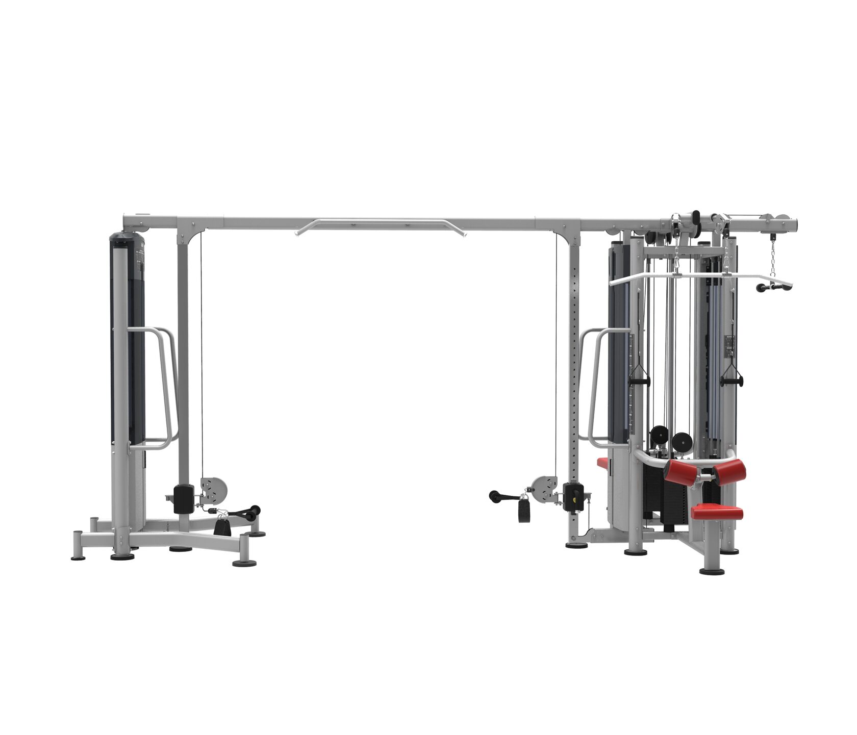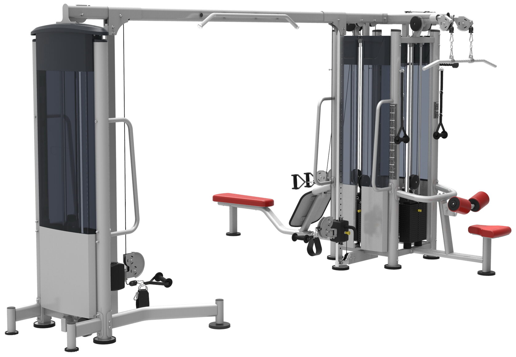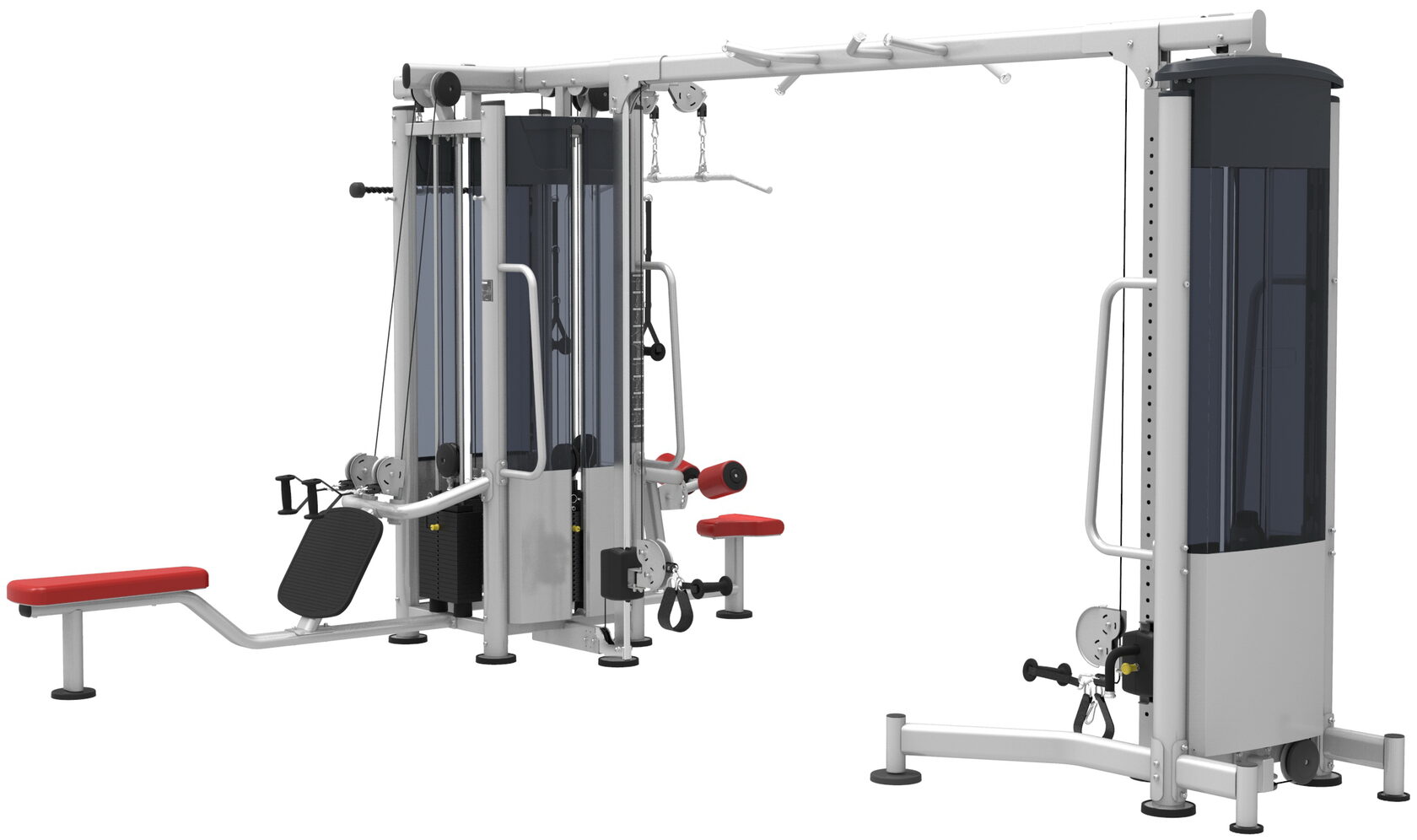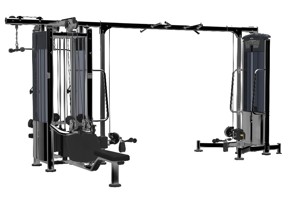 - Варианты тренажерных станций: Двойная тяга сверху, Двойная гребная тяга, Трицепс, Регулируемый кроссовер, Многопозиционные рукоятки для подтягиваний.