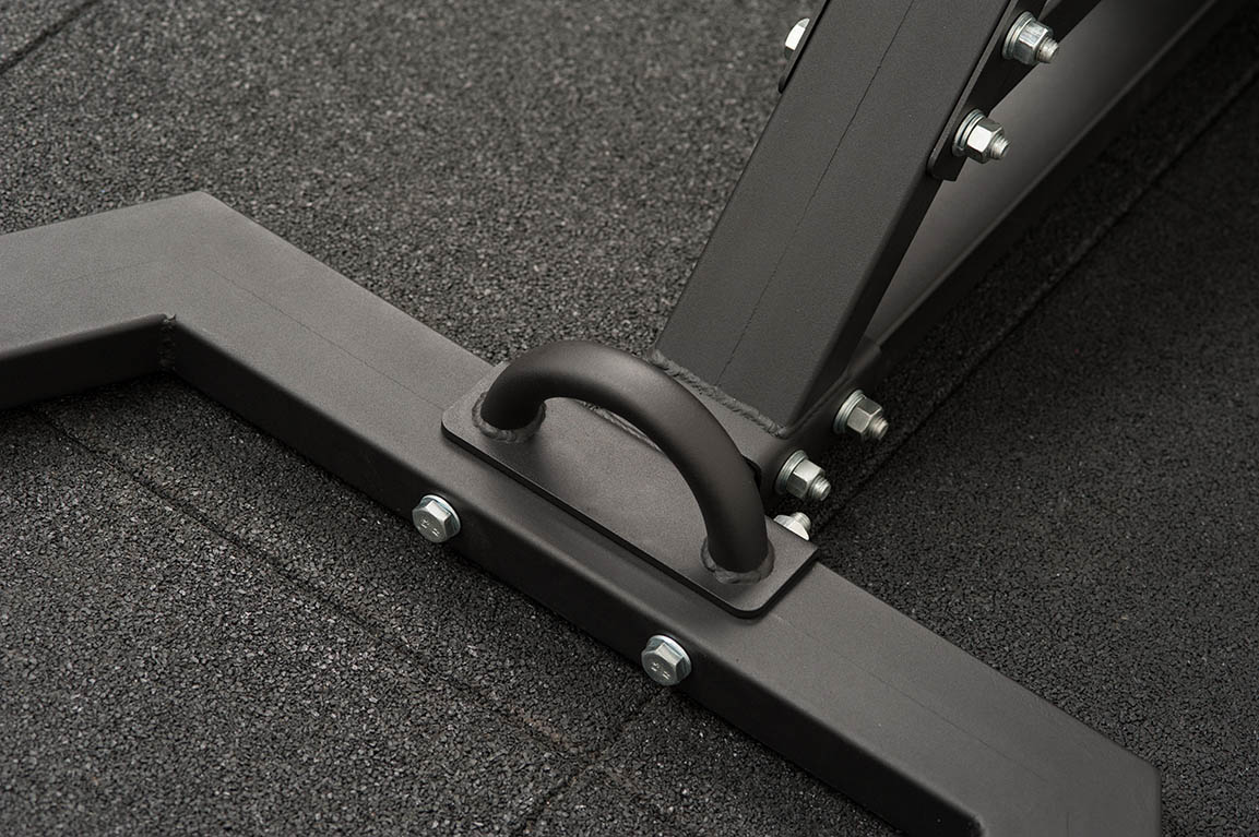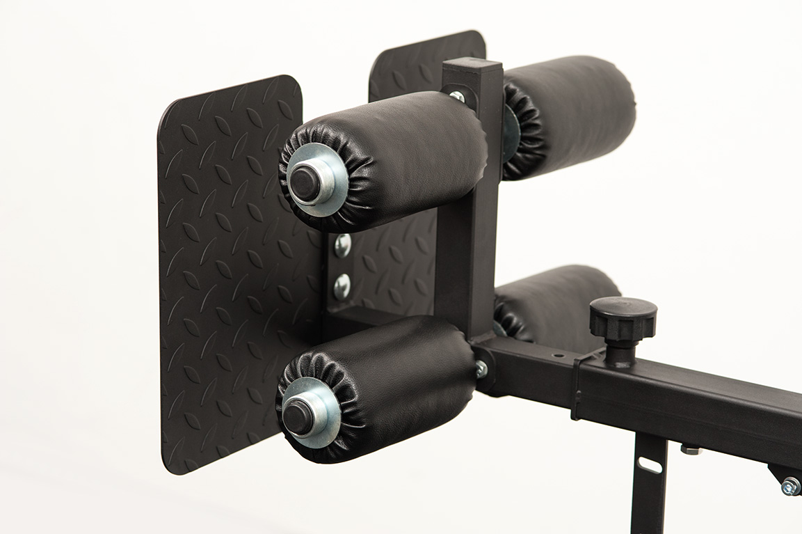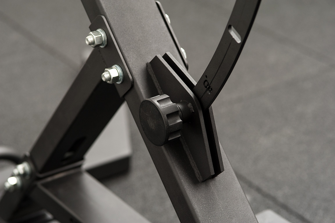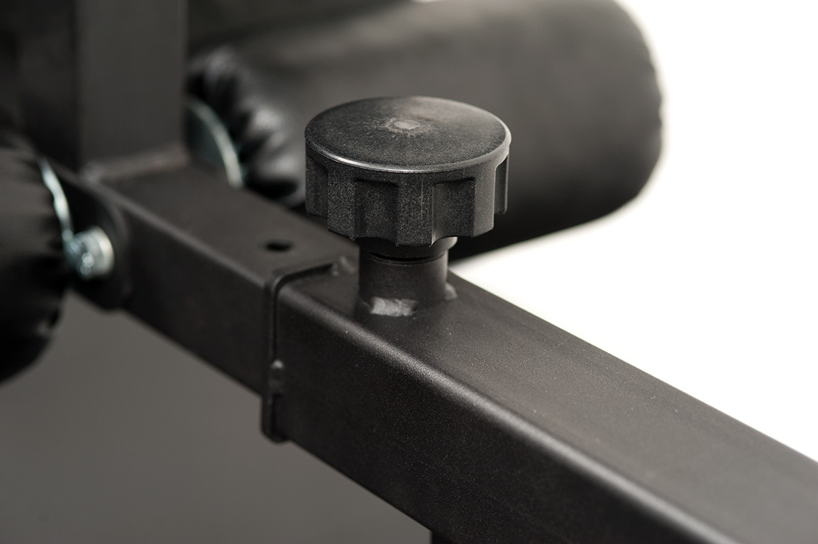 Фиксаторы положения упора для ног и угла наклона снабжены функцией «зажима». Таким образом, они не только фиксируют элементы гиперэкстензии в нужном положении, но и скрепляют их.
