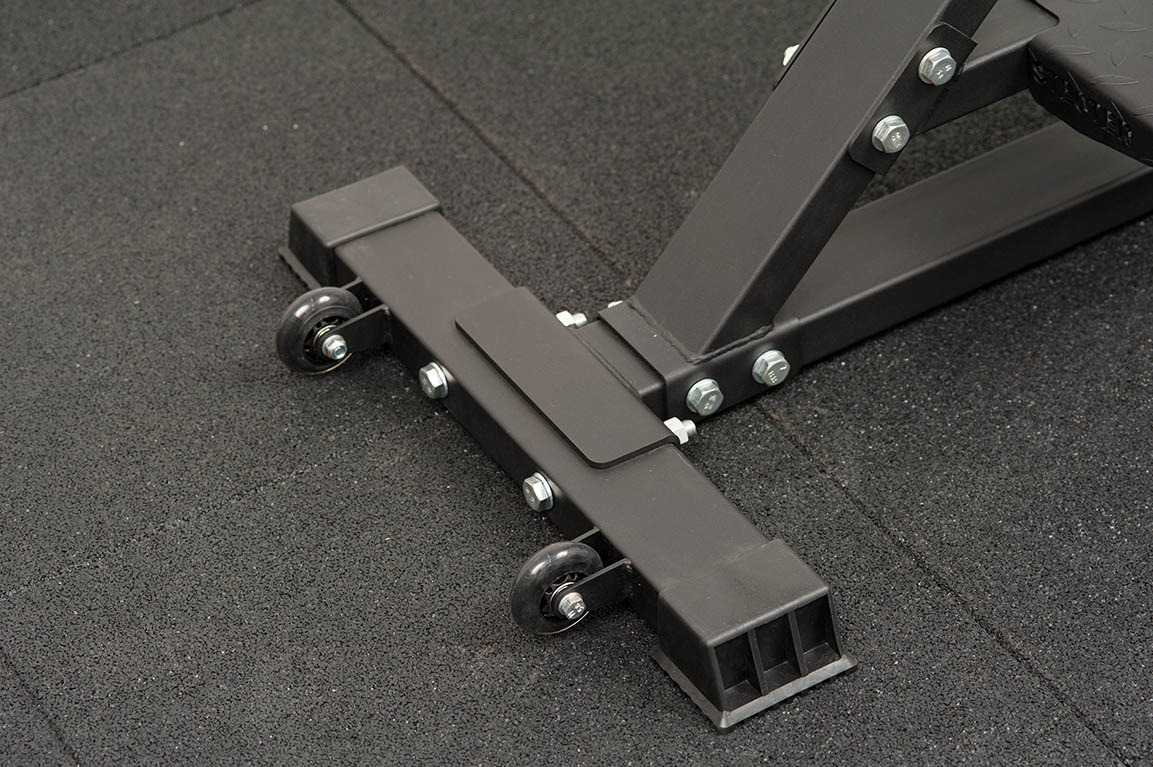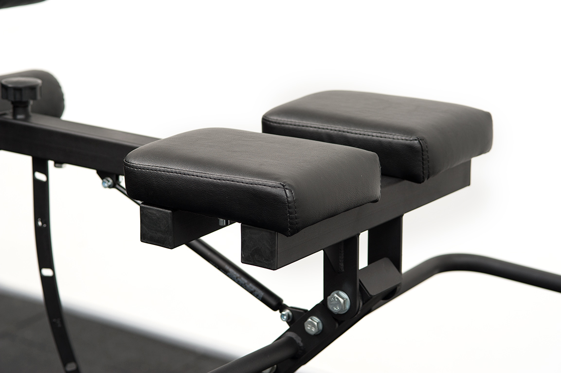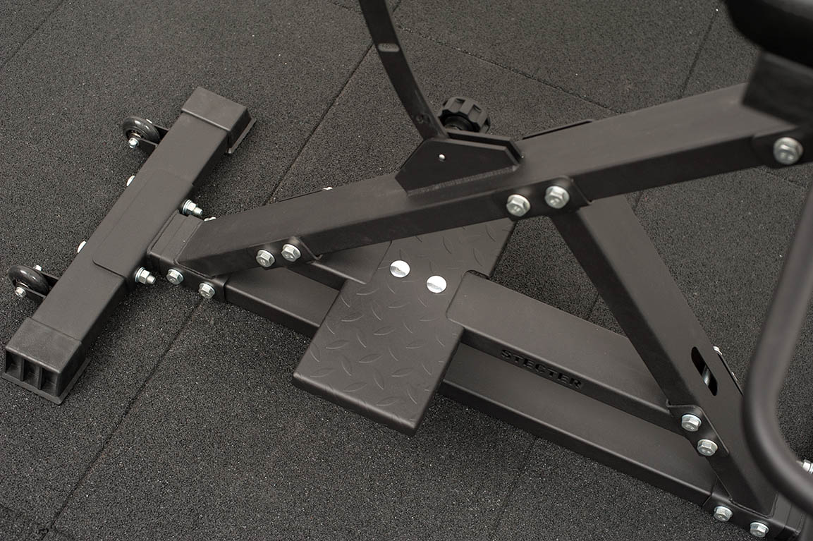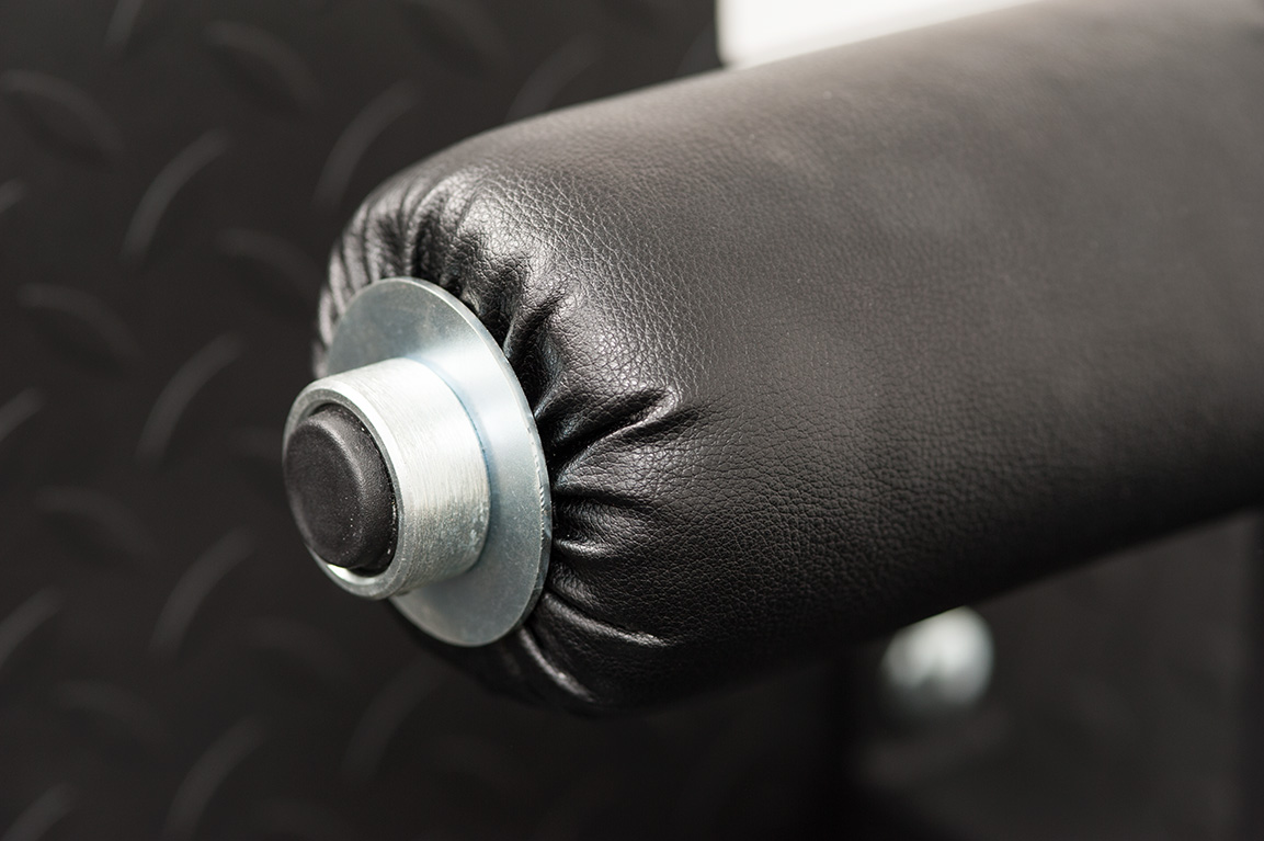 Подушки под бедра и валики для ног обшиты чехлами из высококачественной винилискожи. Опорная пластина для ног имеет выпуклое противоскользящее рифление и травмобезопасный контур с закругленными углами. Специальные транспортировочные колеса и рукоятка позволяют легко перемещать тренажер по залу.