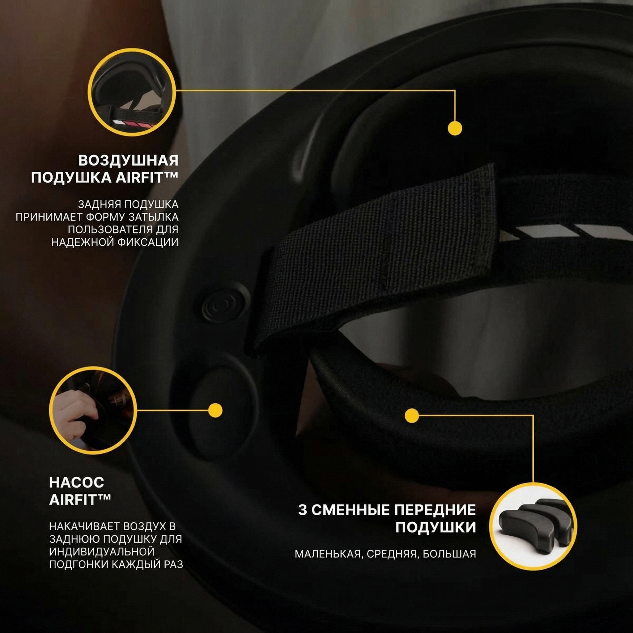 - ✅ Технология AirFit™: Быстро приспосабливается к голове любой формы и размера, благодаря сменной прокладке и надувному пузырю для индивидуальной подгонки.