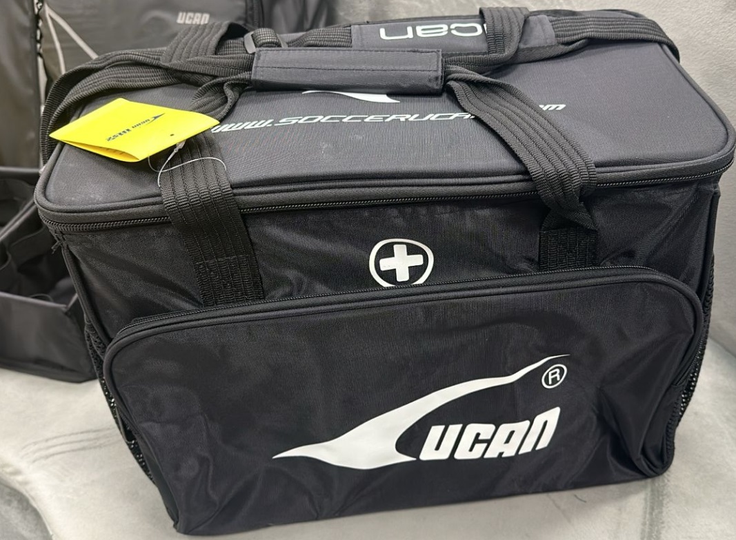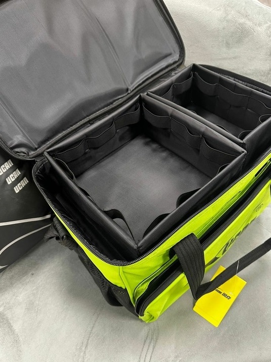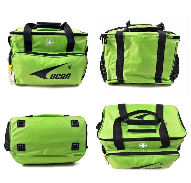 Сумка для спортивных медиков. Материал: полиэстер Цвета: чёрный, зелёный Две короткие ручки, один длинный наплечный ремень. Наружный карман, внутри несколько отделов, включая съёмные. На дне сумки - ножки.