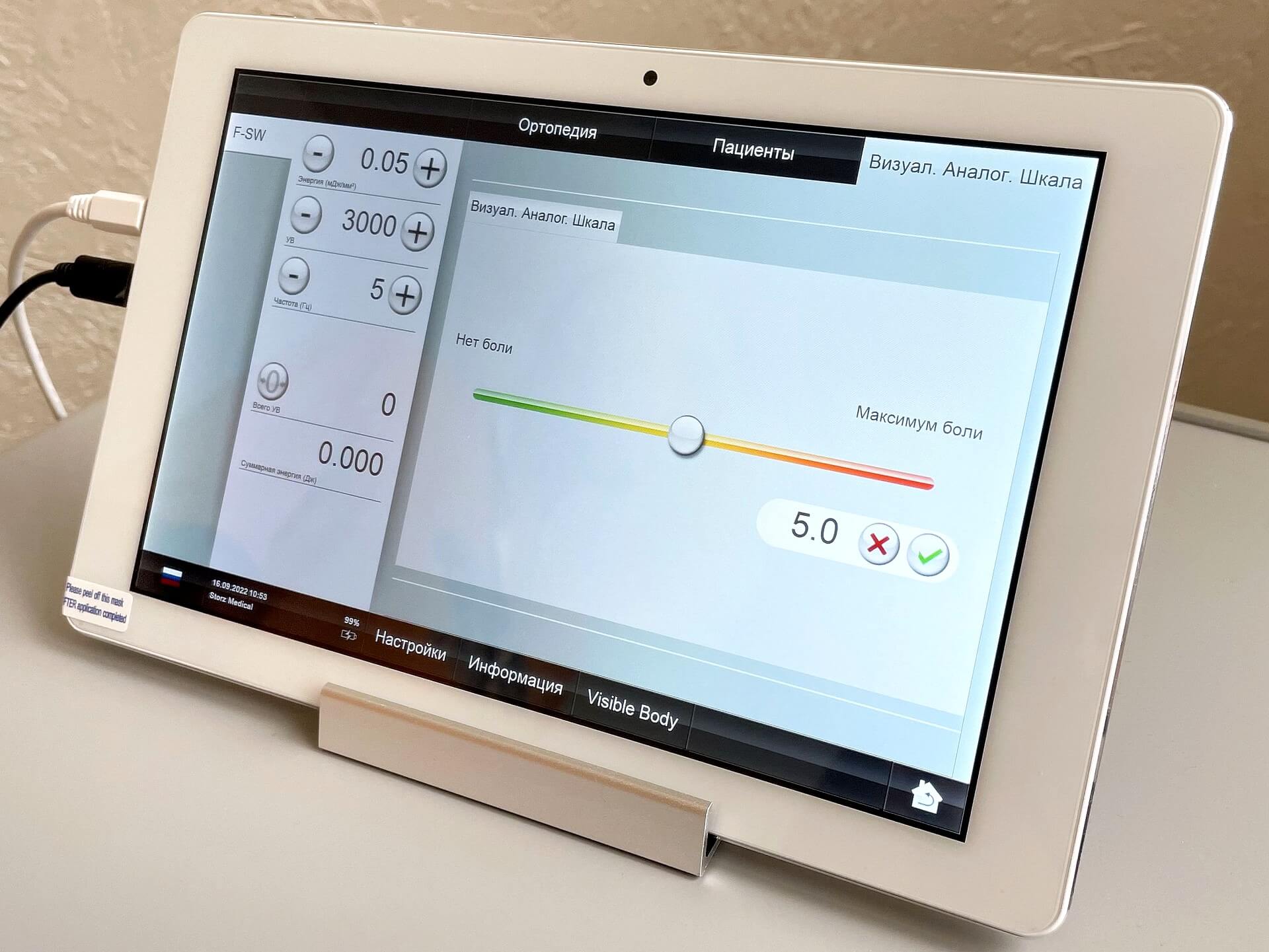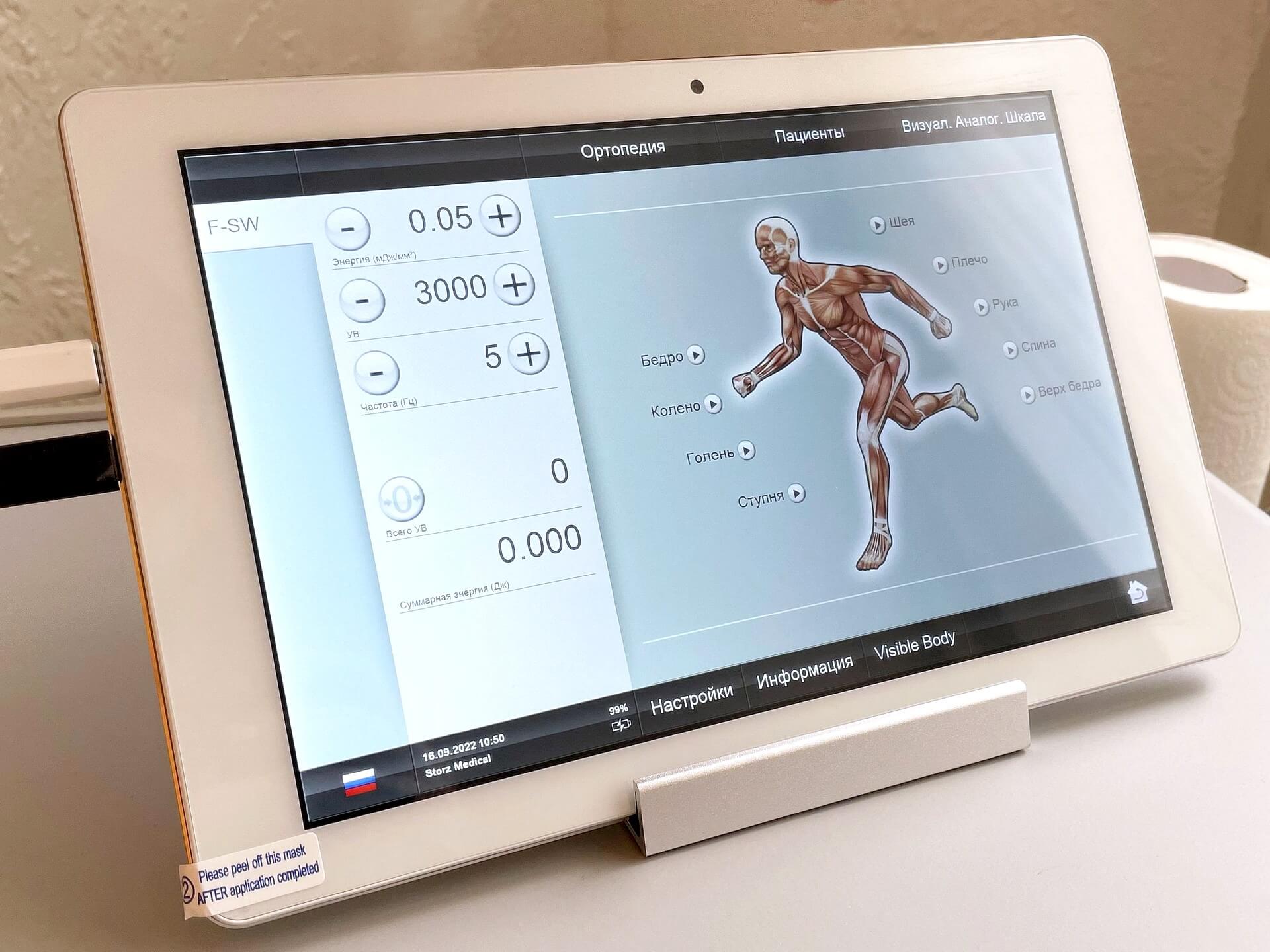 Для удобства специалиста УВТ система оснащена сенсорной панелью управления и эргономичными аппликаторами. Все основные параметры (мощность, частота удара) выводятся на монитор, что делает процедуру абсолютно управляемой и безопасной. 35 интегрированных лечебных программ, возможности сохранения данных и ведения историй пациентов дополнительно облегчают работу врача.