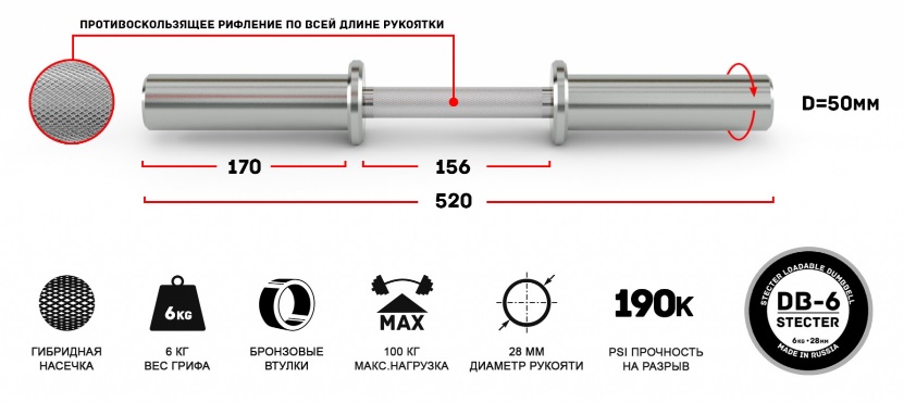 В качестве альтернативы хранению полного набора традиционных гантелей в вашем тренажерном зале, гантельный гриф STECTER DB-6 имеет посадочное место на рукавах длиной 170 мм, что позволяет спортсменам выполнять точные индивидуальные регулировки веса при тренировке с гантелями, используя любые стандартные олимпийские диски в виде утяжелителей. Рукава и рукоятка грифа покрываются белым цинком. Противоскользящее рифление наносится на всю длину рукоятки.