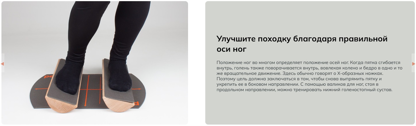 Положение вашей стопы во многом определяет положение осей ваших ног. Когда вы сгибаетесь пяткой внутрь, голень также поворачивается внутрь, вовлекая колено и бедро в одно и то же вращательное движение. Здесь обычно говорят о X-образных ножках. Поэтому цель должна заключаться в том, чтобы снова выпрямить пятку и укрепить ее в боковом направлении. С помощью валиков для ног вы можете, стоя в продольном положении, тренировать нижний голеностопный сустав внутрь (пронация) и наружу (супинация).