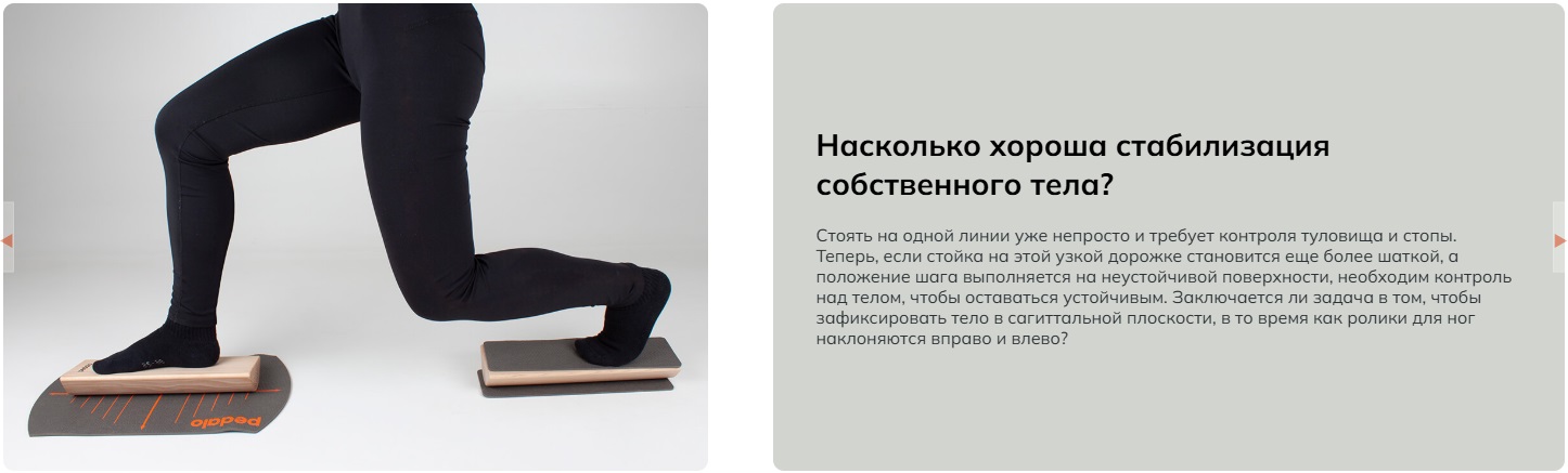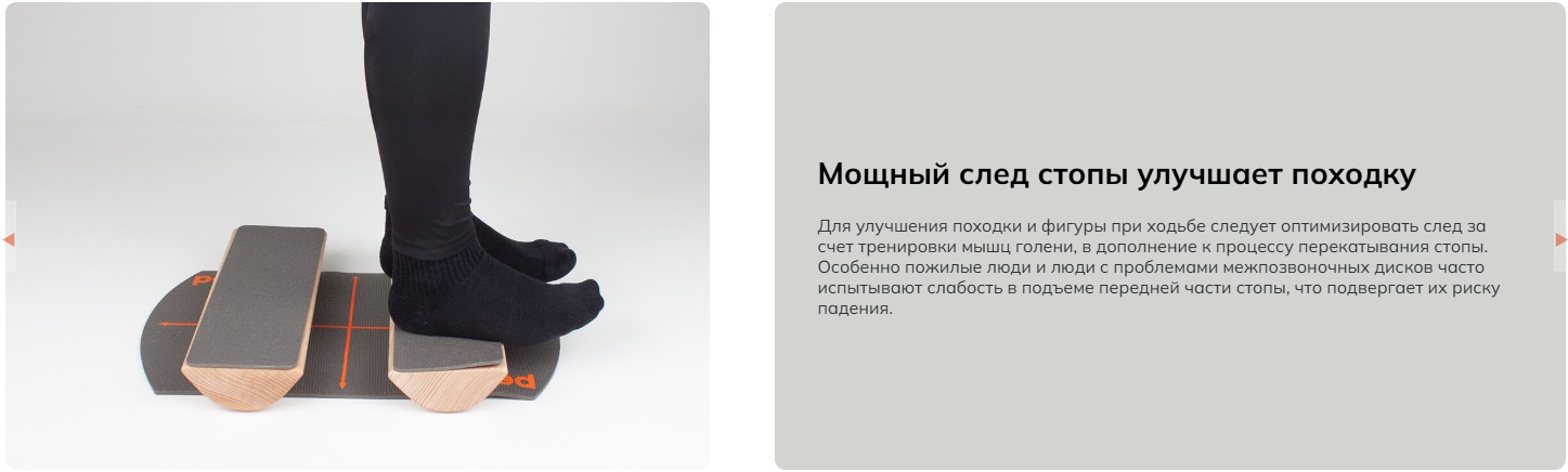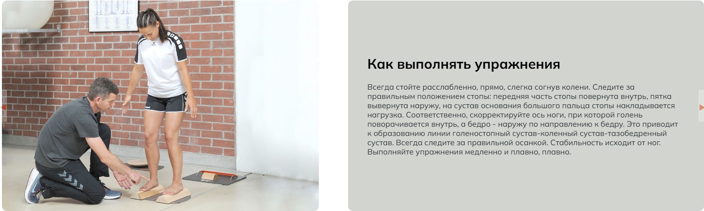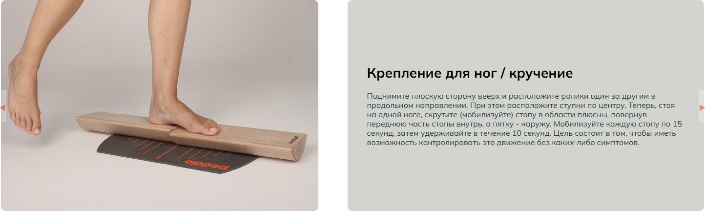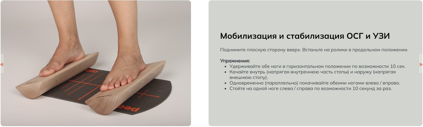 Опоры могут использоваться индивидуально и позволяют выполнять разнообразные упражнения для тренировки ноги - ступня-> лодыжка-> колено-> тазобедренный сустав) для улучшения координации и стабилизации, укрепления и вытягивания стопы для горизонтальной установки свода стопы и тренировка продольной дуги для здоровой ноги.