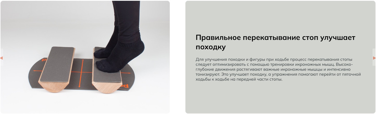 Чтобы улучшить походку и бег, процесс перекатывания стопы следует оптимизировать с помощью тренировки икроножных мышц. Для этого встаньте передней частью стопы поперек валиков для ног. Теперь вы можете растягивать и интенсивно укреплять важные икроножные мышцы с помощью движений вверх-вниз над верхним голеностопным суставом. Это улучшит вашу походку и поможет вам перейти от пяточной ходьбы к ходьбе на передней части стопы. Специальное упражнение также всегда активирует противоположные икроножные мышцы.