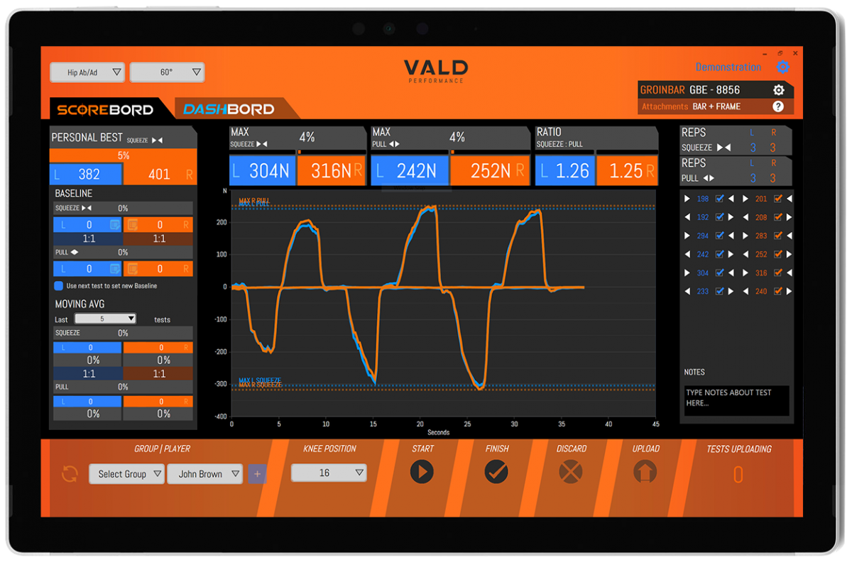 Nordbord оптимизирован для быстроты и лёгкости использования. Просто выберите пациента, проведите тест и увидьте результаты, отображающиеся в реальном времени. Сразу же после теста поделитесь результатами с пациентом, получив мгновенную обратную связь.